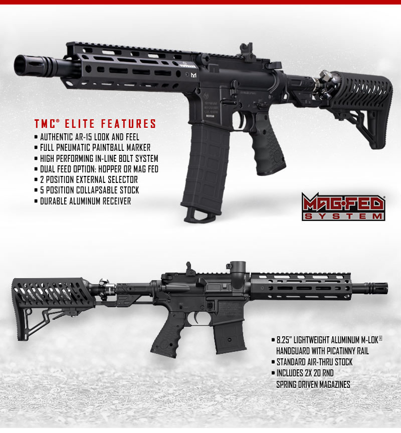 With its competitive performance, tactical tough looks and amazing price, it’s no wonder the Tippmann TMC took the mag-fed tactical paintball world by storm! Now Tippmann follows up on its massive success with an updated, upgraded version for serious mag-fed tactical and scenario players, the Tippmann TMC ELITE! Featuring AR-inspired good looks and updated with new features to bring out the best the platform has to offer; serious tactical paintball players are sure to love the latest offering from the legendary brand!